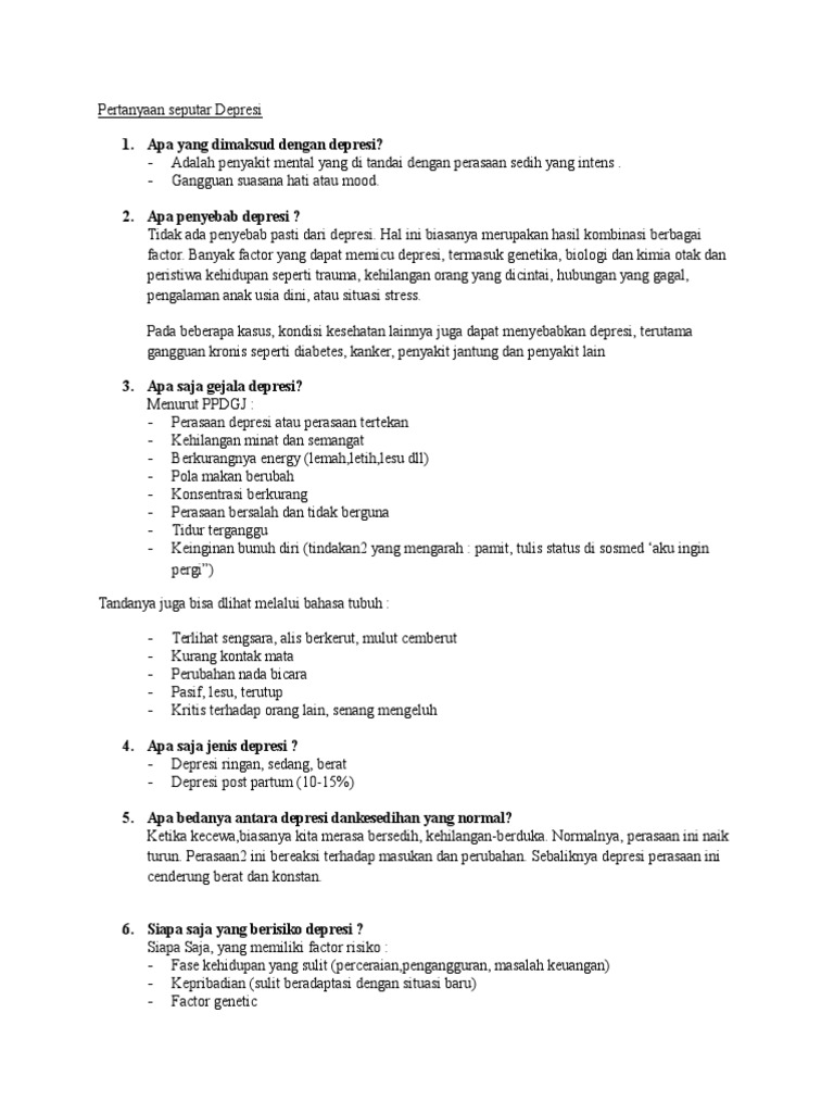 Bisnis Muda Penyebab Depresi Dan Bagaimana Cara Mengatasinya from bisnismuda.id Perubahan mood yang berupa suasana hati yang rendah sering disebut dengan depresi ringan. History menyebutkan penyebab depresi ekonomi yang terjadi saat itu adalah produksi barang yang menurun dan meningkatnya angka pengangguran. Depresi yang dibiarkan berlanjut dan tidak mendapatkan penanganan bisa menyebabkan terjadinya penurunan produktifitas. Penyebab depresi adalah faktor biologi, faktor genetik dan faktor psiko sosial. Depresi adalah gangguan mental yang berbeda dengan stres dan tidak boleh disepelekan. Depresi remaja adalah suatu kelainan pada kesehatan mental yang serius yang menyebabkan perasaan sedih dan kehilangan minat dalam aktivitas pada usia remaja. Perlu anda ketahui bahwa depresi adalah salah satu penyakit yang sangat kompleks. Depresi adalah salah satu gangguan mental yang paling umum terjadi pada setiap orang.